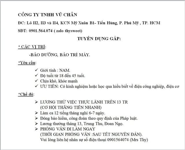 CÔNG TY TRÁCH NHIỆM HỮU HẠN VŨ CHÂN tuyển dụng